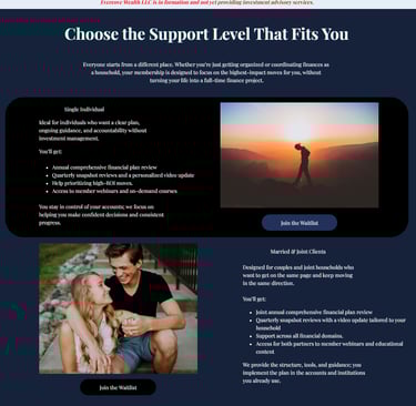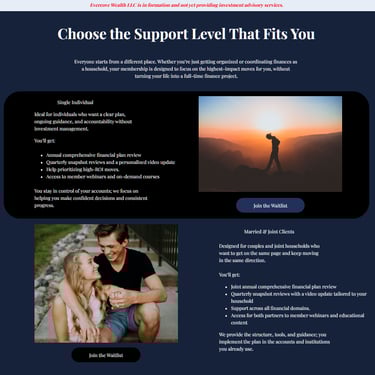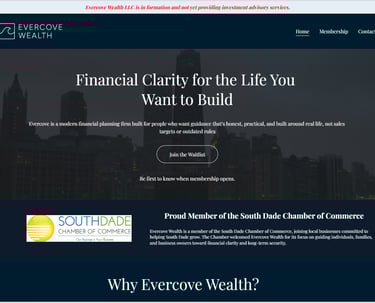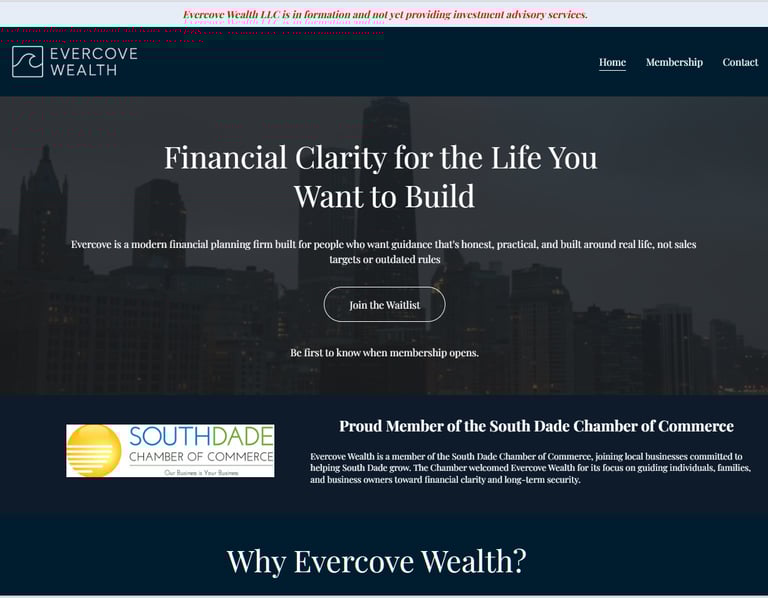 Evercove Wealth is a membership-based financial advisory firm serving young professionals and families. Harbor Webworks designed and built a fast, mobile-first website that clearly explains the membership model and makes it easy for visitors to reach out.